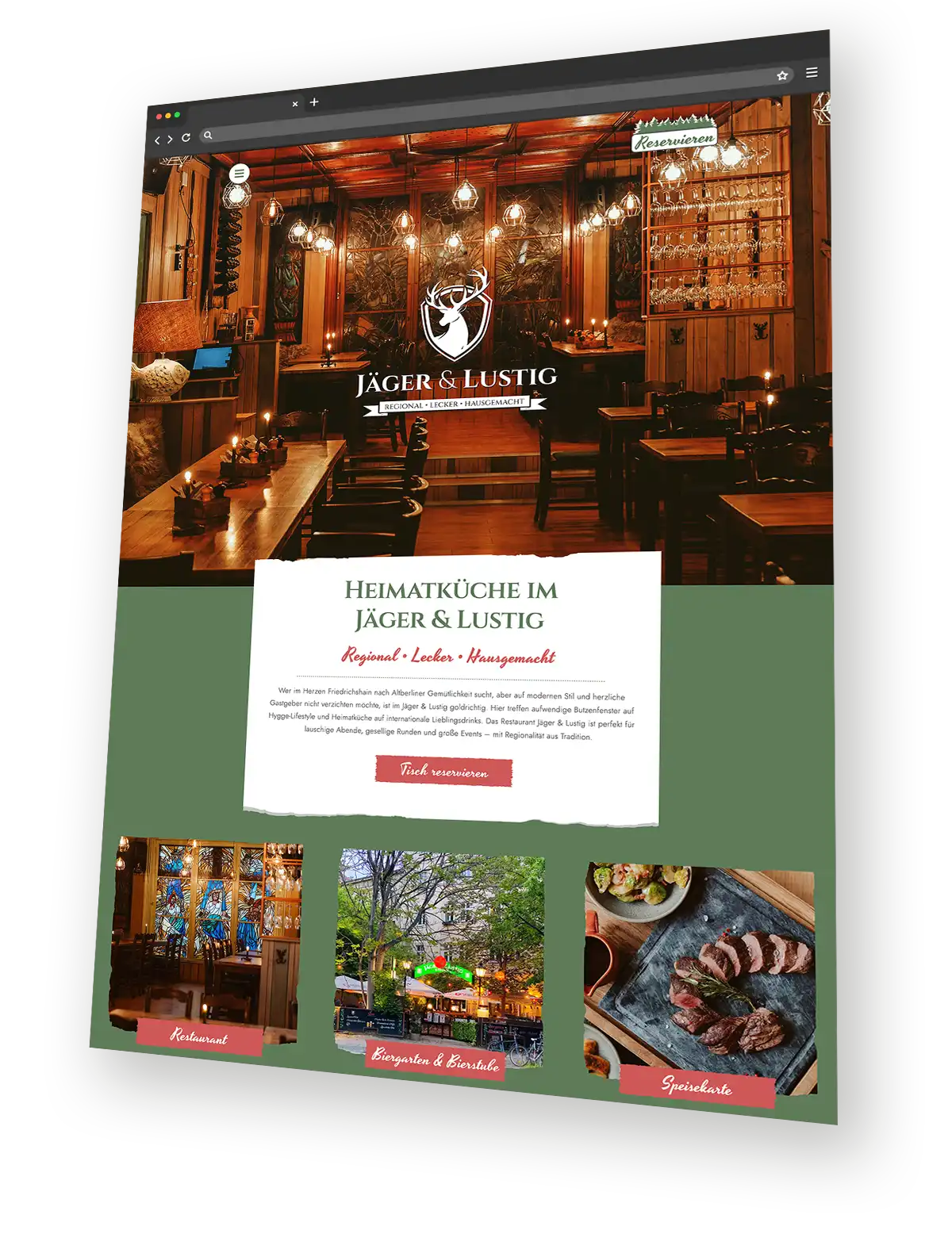 Tradition trifft Großstadtflair: Für das Berliner Wirtshaus Jäger & Lustig haben wir ein stimmiges Gesamtkonzept umgesetzt – von Logo und Farbwelt bis zum strukturierten Webauftritt. Ziel war es, die rustikale Atmosphäre des Lokals mit der digitalen Erwartungshaltung moderner Gäste zu verbinden.