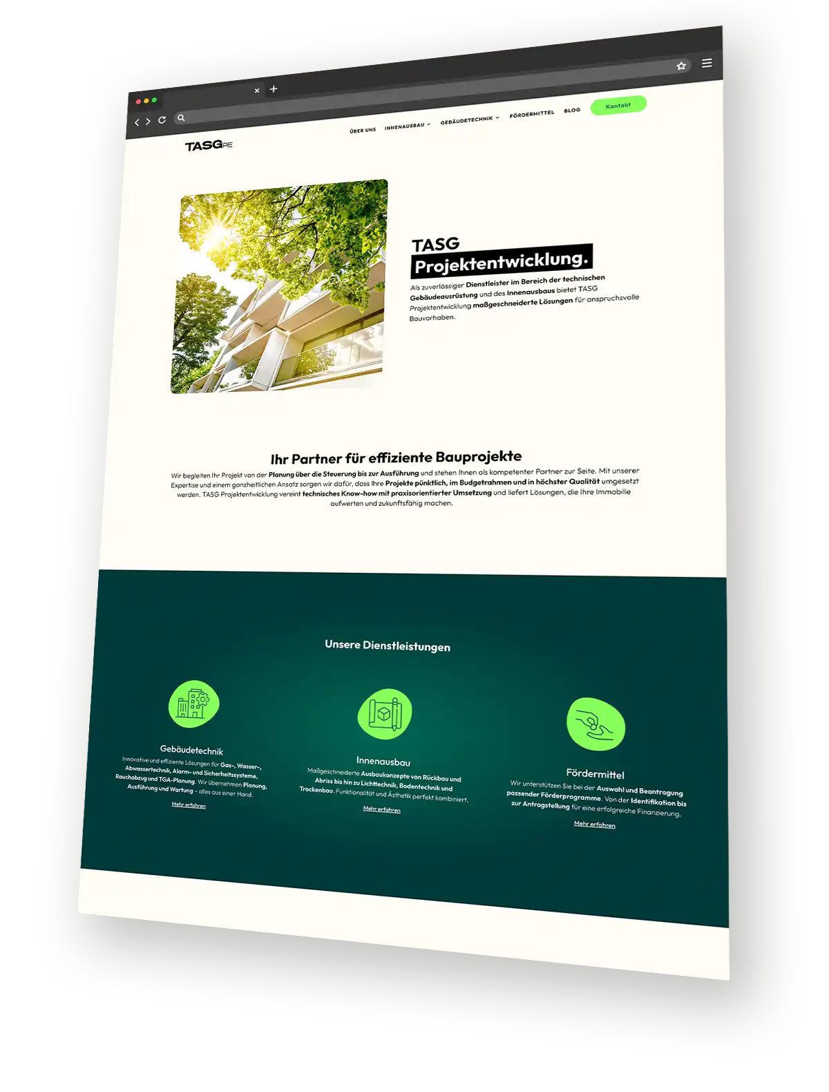 Für TASG Projektentwicklung haben wir den kompletten Markenauftritt neu gestaltet: Vom Logo und der Farbwelt bis zur Website mit klarer Struktur und technischen Feinheiten. Das Design ist reduziert, hochwertig und vertrauenswürdig – genau wie die Leistungen der TASG im Bereich nachhaltiger Projektentwicklung. Auch inhaltlich ist die Seite fit für die neue Suchgeneration: logisch gegliedert, semantisch sauber und vorbereitet auf die Anforderungen von KI-Suchsystemen.