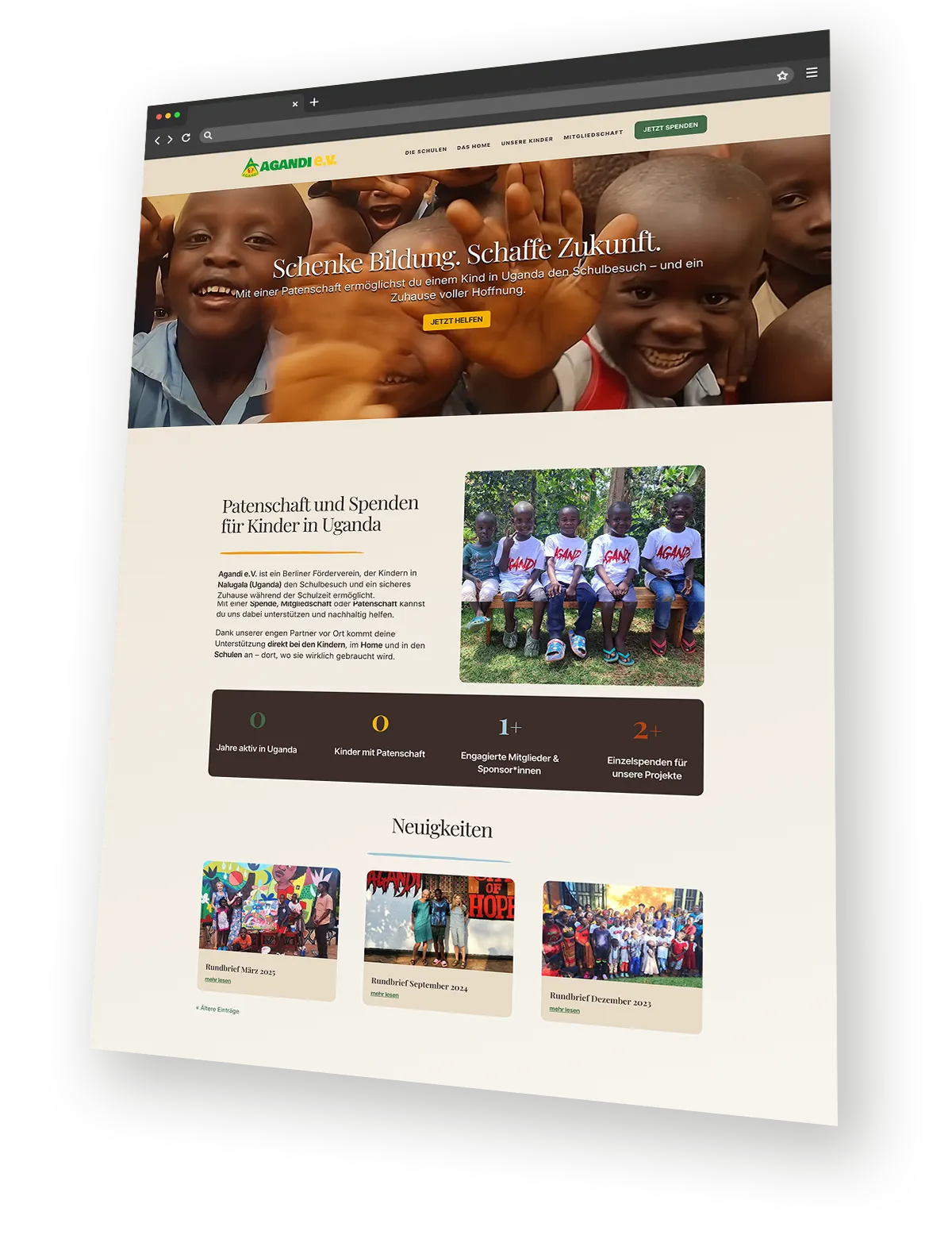 Für die NGO Agandi haben wir einen umfassenden Relaunch realisiert. Die bestehende Website war in die Jahre gekommen – inhaltlich stark, aber visuell und technisch nicht mehr zeitgemäß.