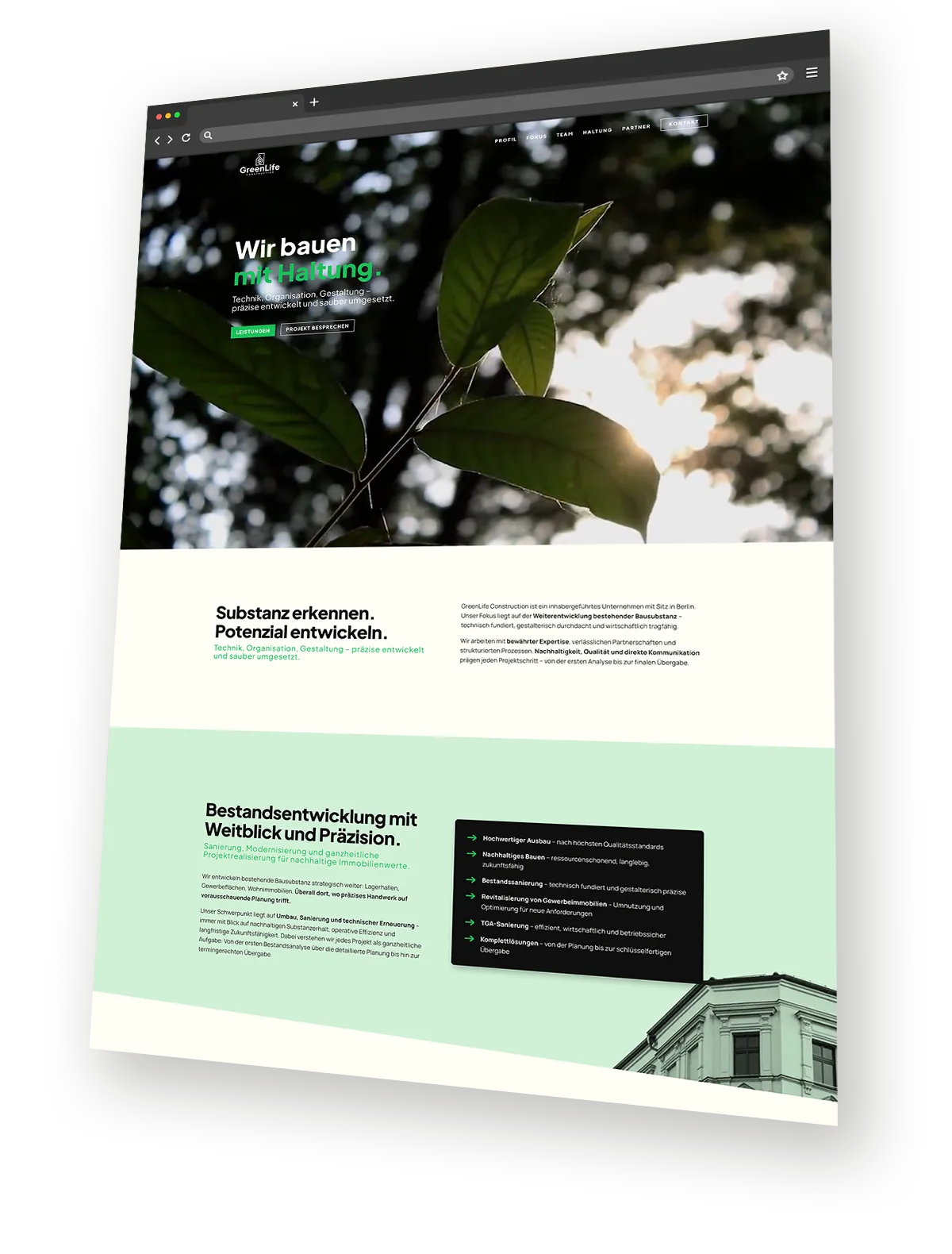 Für das Bauunternehmen Greenlife Construction durften wir ein frisches Branding und einen modernen Webauftritt entwickeln – inklusive Logo, Farbkonzept und Corporate Identity. Der Fokus: Vertrauen aufbauen und gleichzeitig Kompetenz im Bereich nachhaltiges Bauen und Projektentwicklung vermitteln.