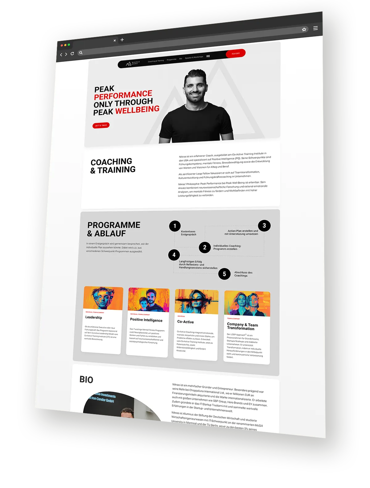Für den Coach Nikras Agha haben wir eine moderne visuelle Identität entwickelt: Logo, Farben, Typografie und Gesamtbild stammen aus unserer Feder. Die Website greift diese Linie konsequent auf – reduziert, klar und professionell. Sie bringt seine Inhalte auf den Punkt, ohne visuell zu überladen. Wir begleiten Nikras bereits seit mehreren Jahren und entwickeln sein Design stetig weiter.