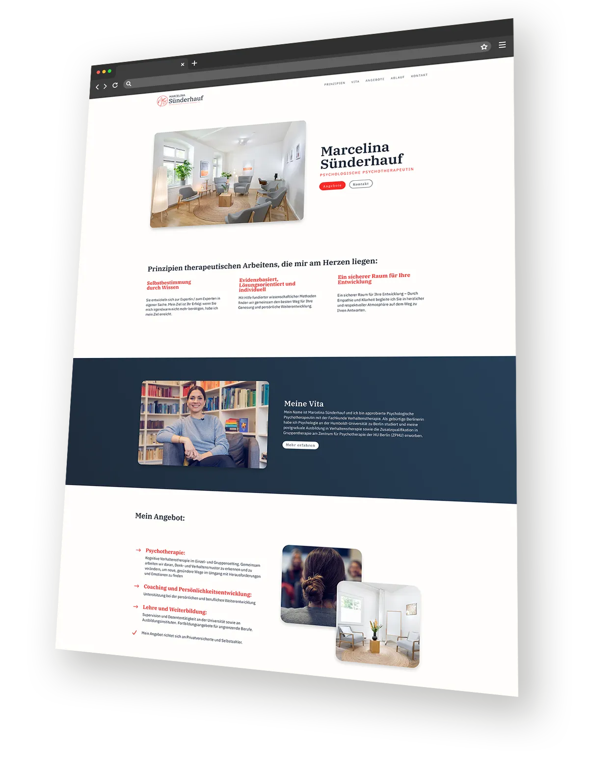 Für die psychologische Psychotherapeutin Marcelina Sünderhauf haben wir eine moderne, vertrauenswürdige Website erstellt. Das Design und die Struktur unterstützen zugleich die psychologische Arbeit und eine klare Nutzerführung. Inhalte wie Gruppentherapie, Verhaltenstherapie und Coaching werden verständlich und empathisch präsentiert, damit potenzielle Klient*innen sich gleich angesprochen fühlen – online wie persönlich. Die Seite ist responsiv, inhaltlich übersichtlich aufgebaut und technisch vorbereitet für gute Sichtbarkeit in Suchmaschinen sowie KI-Suchsystemen.