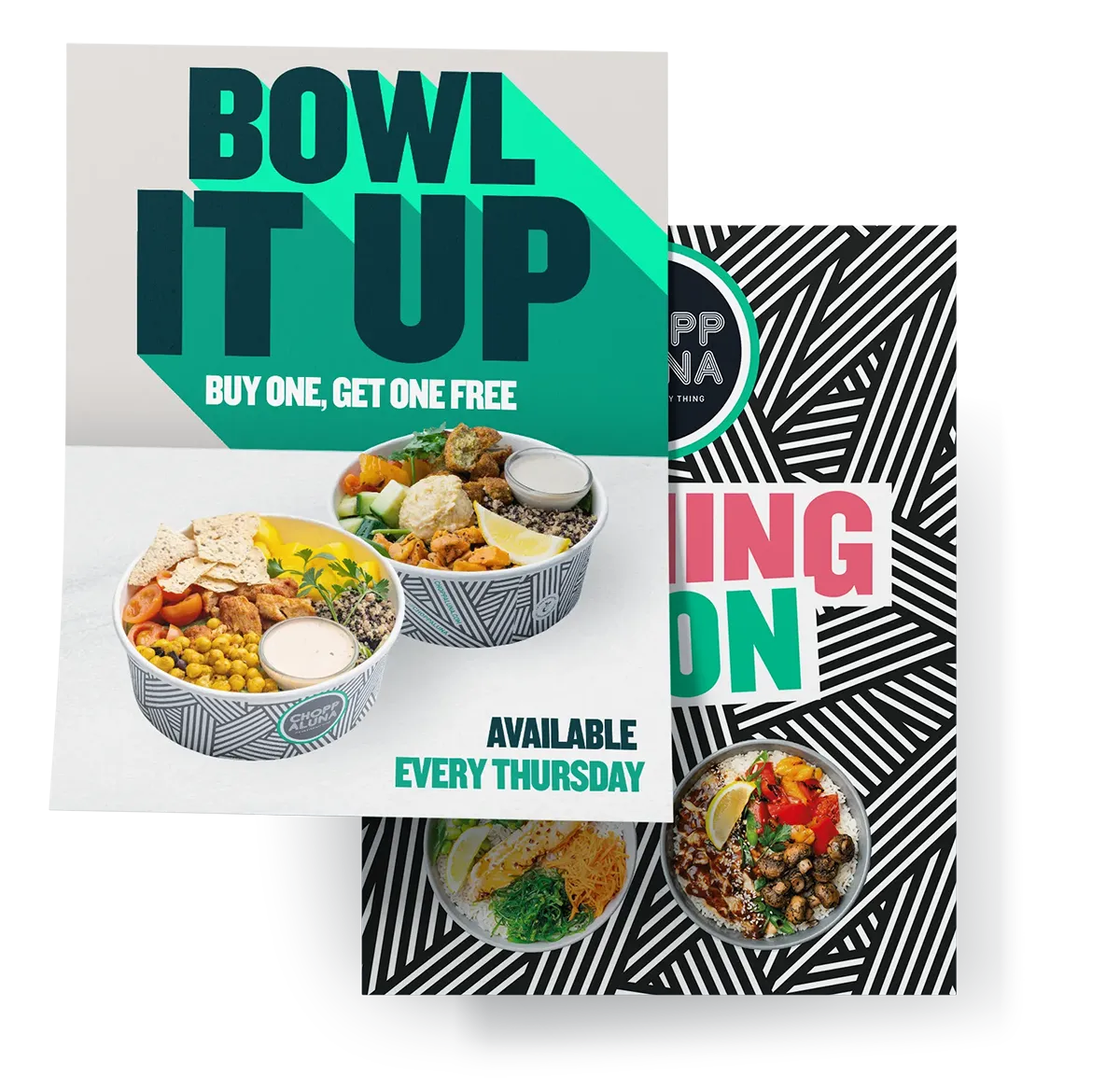 Für Choppaluna, eine Healthy Fast Food Marke, die auf Frische, clevere Bearbeitung und kreative Präsentation setzt, haben wir ein vielseitiges Grafikdesign-Paket umgesetzt. Die Arbeiten umfassten Flyer, großformatige Wandbeklebungen, Menüscreens sowie saisonale Kampagnenmotive.
