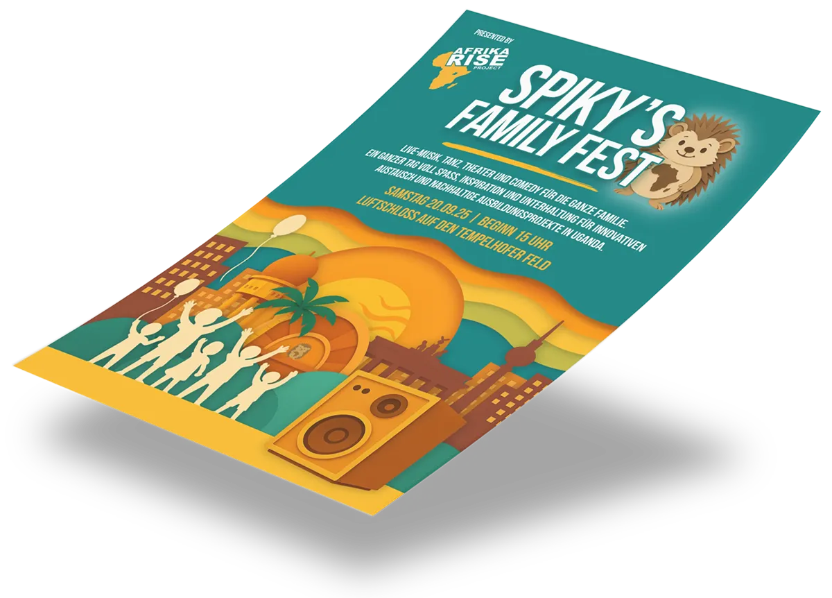 Für das Spiky’s Familyfest auf dem Tempelhofer Feld – initiiert von Johnny Strange (Culcha Candela) und der NGO Afrika Rise – haben wir ein farbenfrohes Poster im Scherenschnitt-Stil gestaltet. Kindgerecht und detailreich kombiniert es Berliner Wahrzeichen wie den Fernsehturm, das Brandenburger Tor, den Wasserturm und das Luftschloss mit spielerischer Leichtigkeit und lokalem Charme – ein Design, das Familien anspricht und die besondere Atmosphäre des Events visuell einfängt.